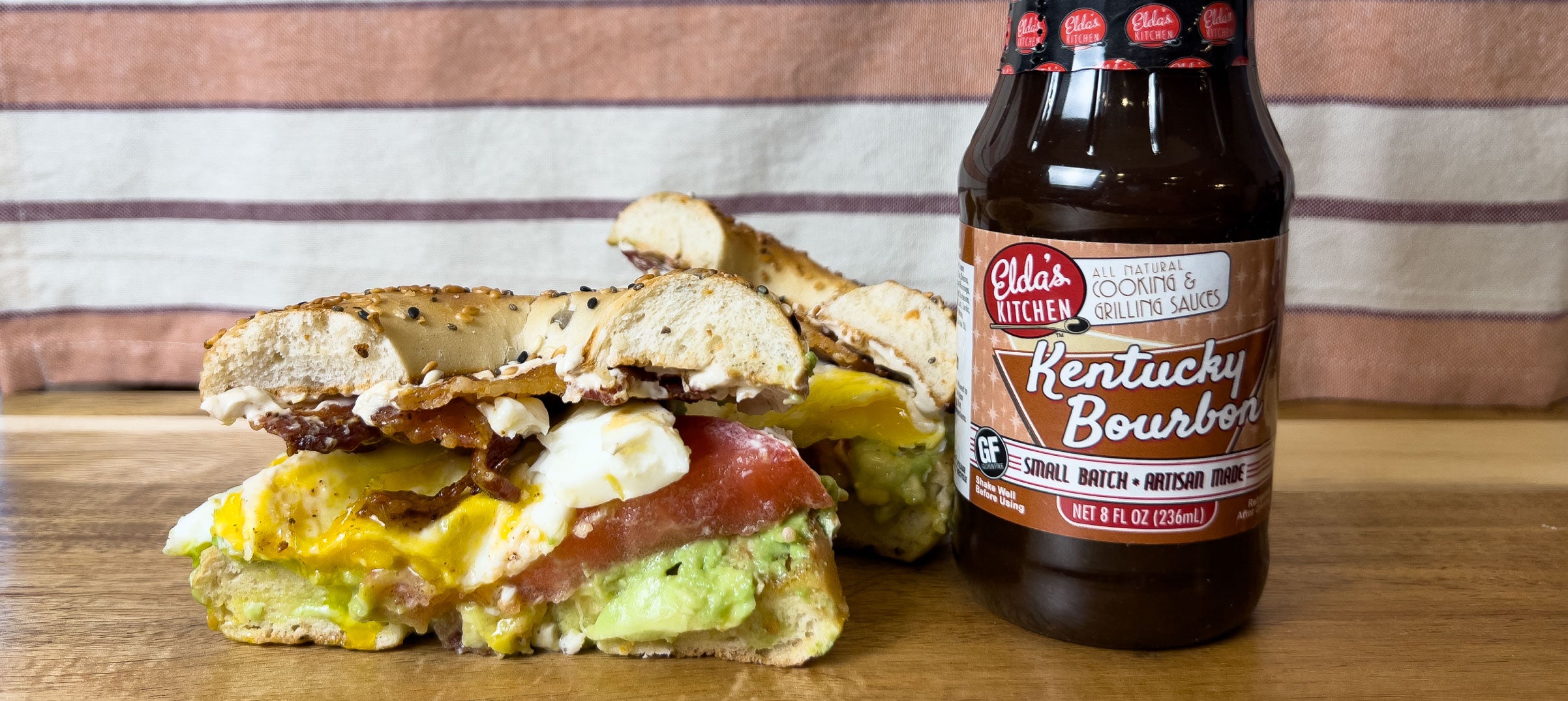 Combine cream cheese with Elda’s Kitchen Kentucky Bourbon Sauce and spread on the top halves of the bagels.