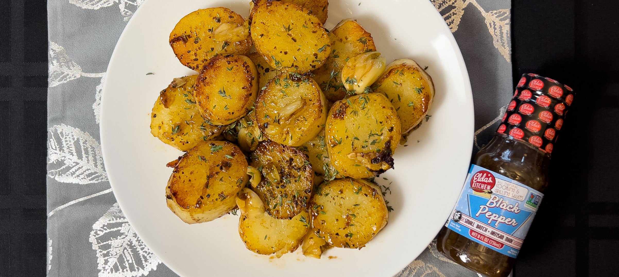 Transfer the potatoes and smashed garlic to the hot baking pan from the oven. In the skillet, melt the remaining 4 tbsp of butter and add thyme, chicken broth, and ¼ bottle of Elda’s Kitchen Black Pepper Sauce. Bring to a light boil, then pour over the potatoes and garlic in the pan. Cook in the oven for about 30 mins, until the potatoes are fork-tender. Top with any extra liquid from the pan and a few sprinkles of fresh thyme leaves.